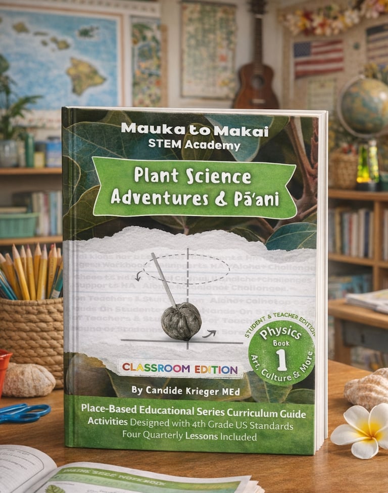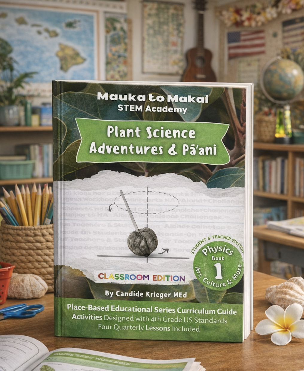 150+ page, full-color STEM workbook that blends Hawaiian cultural knowledge, storytelling, and hands-on science for grades 3–5. This combined Teacher & Student Edition includes everything needed for classroom or home use. Aligned to NGSS and Nā Hopena A‘o (HĀ), the curriculum integrates physical science concepts through place-based, culturally grounded learning. Each lesson begins with an original moʻolelo and guides students through investigations, data collection, engineering design, and creative reflection. Through activities using canoe plants, students learn about physics while building a toy out of plant parts.